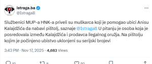 Kao što smo već objavili, pripadnici MUP-a HNK danas su lišili slobode osobu koja je pomogla Anisu Kalajdžiću da nabavi oružje kojim je ubio Aldinu Mujić.