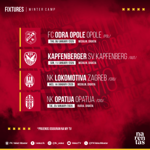 Posljednju provjeru pred nastavak prvenstva fudbaleri Veleža imat će 29. januara, kada je planirana prijateljska utakmica protiv ekipe Posušja. Informacije o mjestu odigravanja i tačnom terminu ovog susreta bit će naknadno objavljene.