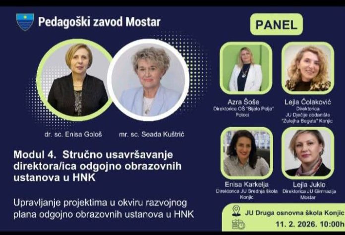 U organizaciji Pedagoškog zavoda Mostar u izuzetno ugodnom, gostoprimljivom i inspirativnom ambijentu JU Druge osnovne škole u Konjicu je 11.2.2026. realizovan Modul 4, u okviru Stručnog usavršavanja direktora/ica vrtića, osnovnih i srednjih škola u HNK. “Osim planiranih prezentacija i panela imali smo priliku upoznati, te razmijeniti primjere dobre prakse i pozitivna iskustva sa učenicima i zaposlenicima Druge osnovne škole u pratnji uvažene direktorice Munevere Tinjak.