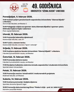 Univerzitet „Džemal Bijedić“ u Mostaru od 9. do 14. februara 2026. godine obilježit će 49. godišnjicu svog osnivanja, postojanja i rada, realizacijom sveobuhvatnog programa svečanih akademskih, naučnih, kulturnih i sportskih aktivnosti.