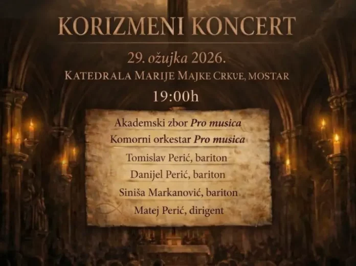 Svečani korizmeni koncert održat će se u nedjelju, 29. marta 2026. godine u 19 sati u Katedrali Marije Majke Crkve u Mostaru, gdje će nastupiti Akademski hor Pro musica i Komorni orkestar Pro musica uz trojicu solista i dirigenta Mateja Perića.