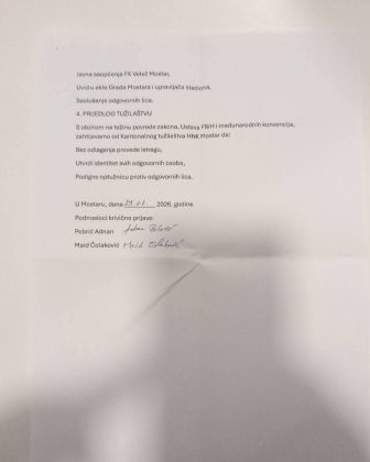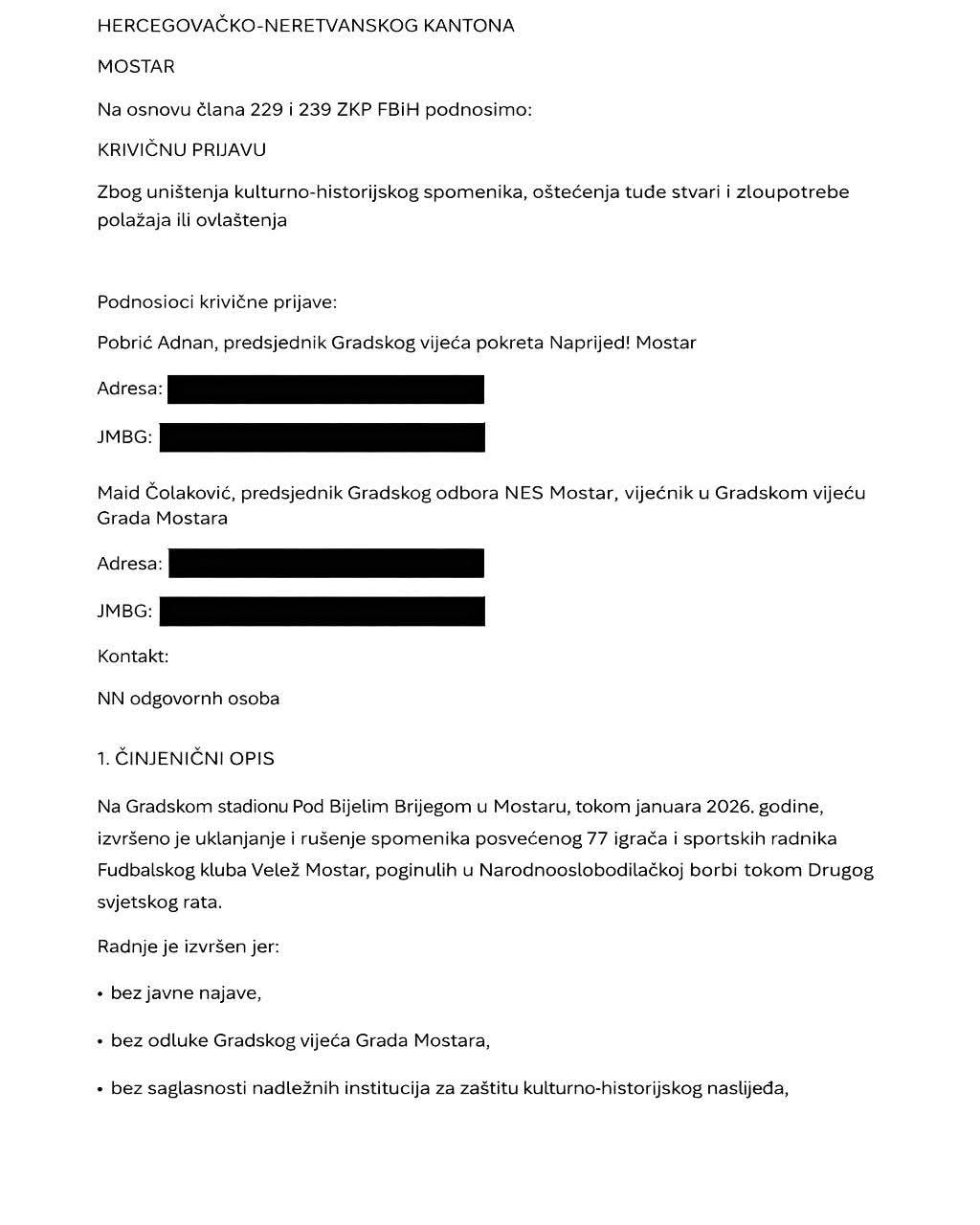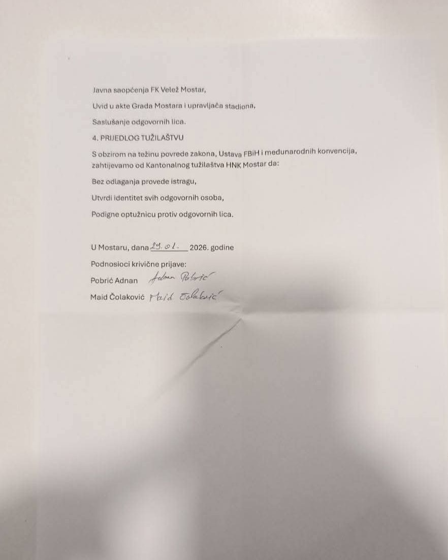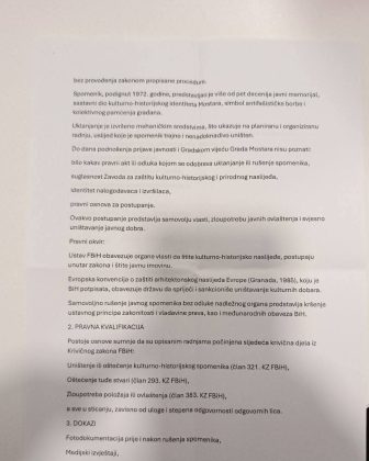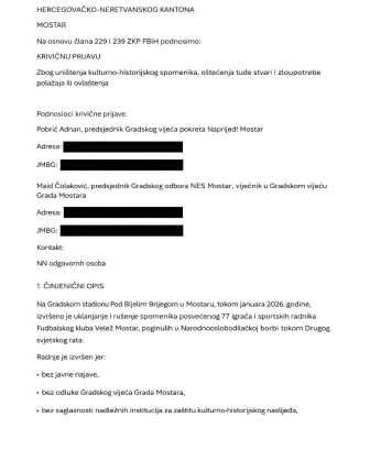 Prema navodima iz prijave, tokom januara 2026. godine uklonjen je i srušen spomenik posvećen 77 igrača i sportskih radnika Fudbalskog kluba Velež Mostar koji su poginuli u Narodnooslobodilačkoj borbi tokom Drugog svjetskog rata.