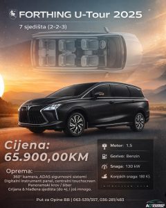Predstavljamo vam Forthing U-Tour 2025 – moderan, snažan i izuzetno prostran 7-sjedišni MPV sa rasporedom 2-2-3, savršen izbor za porodicu, duga putovanja i poslovnu upotrebu.