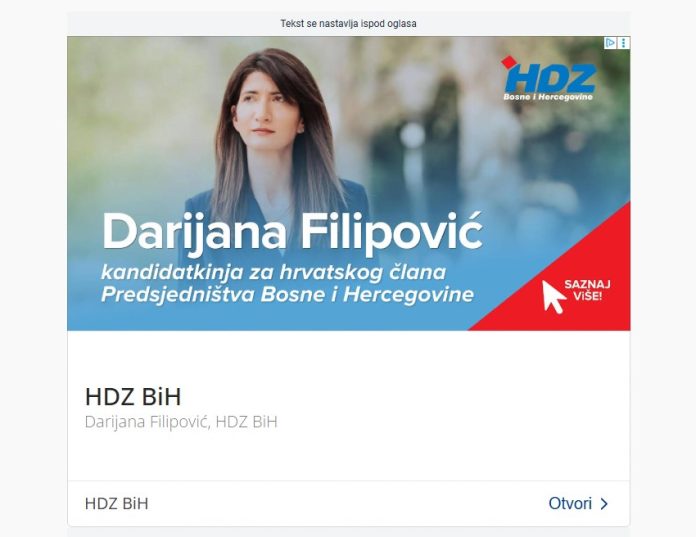 Posljednjih dana se pojavljuju plaćeni oglasi u kojima se Darijana Filipović iz HDZ-a predstavlja kao “kandidatkinja za hrvatskog člana Predsjedništva Bosne i Hercegovine”.